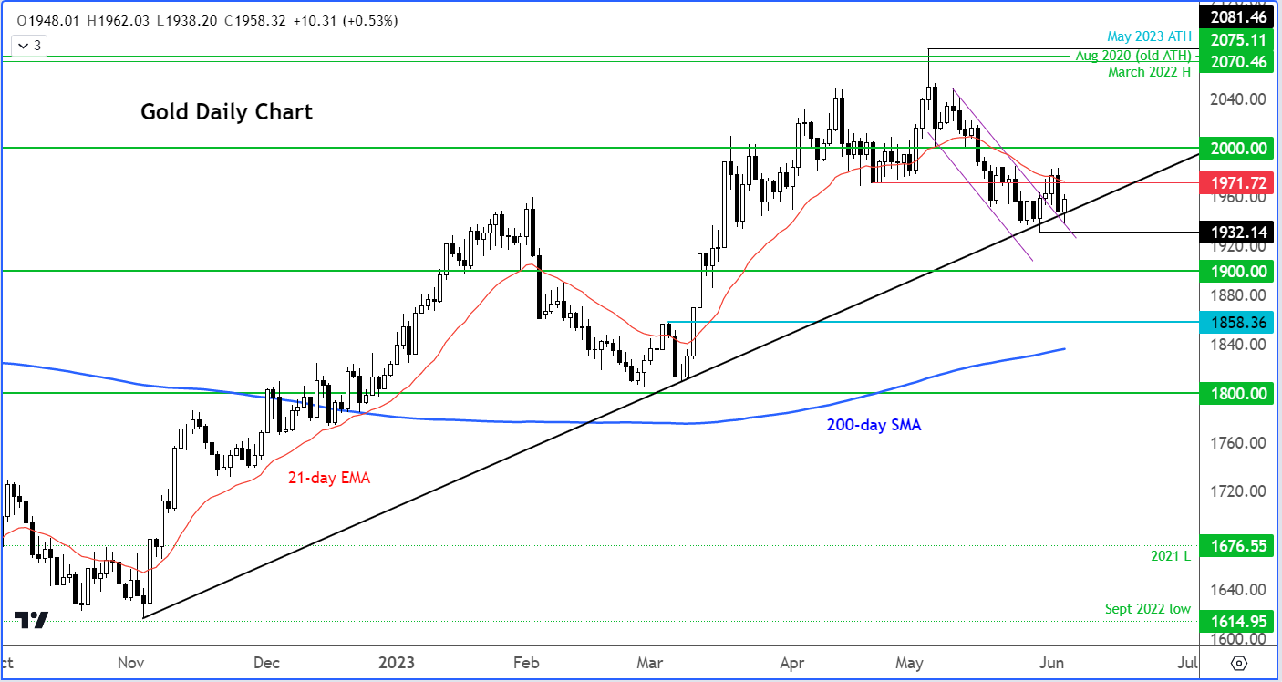 黄金在1935美元左右的水平支撑线和看涨趋势线交汇处及时反弹。只要多头能够坚定地守住趋势线,就有可能遏制空头并维持黄金前景的乐观。
